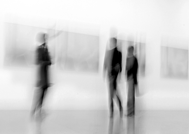 Bir galeride gezenl üç kişinin siyah beyaz ve bulanık fotoğrafı. Duvarlarda yatay çerçeveli tablolar asılı.