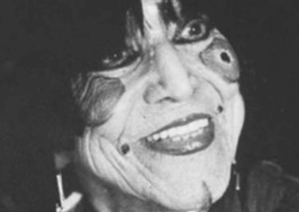 Siyah beyaz bir portrede, yüzü detaylı şekilde boyanmış bir kişi bulunuyor. Göz çevresinde koyu halkalar, yanaklarında desenler var. Saçları siyah ve alnına düşüyor, dudaklarında belirgin bir gülümseme yer alıyor.