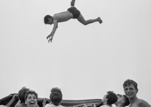 Açık gri arka plan önünde, ortada havada yüzüstü şekilde duran genç bir erkek var, altında kahkaha atan ve bir örtü tutan altı genç yer alıyor, neşeli bir an canlandırılmış.