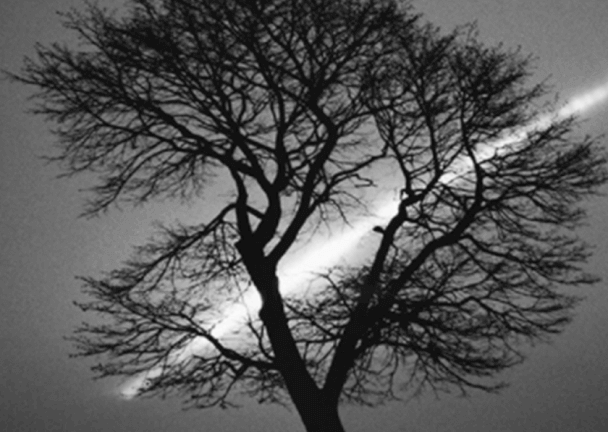 Açık gri arka planda silik bir gökyüzü, merkezde dalları çıplak geniş bir ağaç var, ağacın arkasından çapraz şekilde beyaz bir ışık topluluğu bulunuyor.
