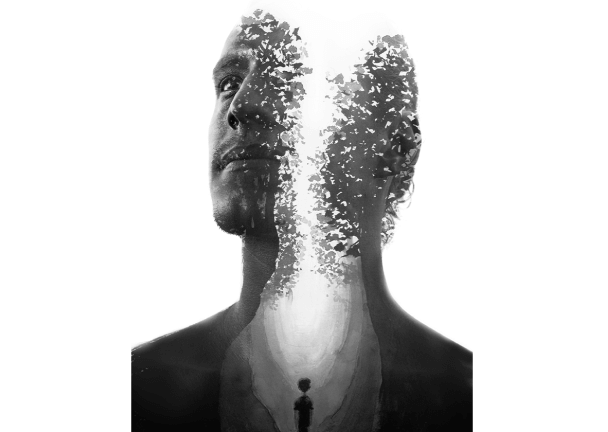 Görselde 30’larında bir erkeğin yüzü profilden görülüyor. Yüzün içinde ağaçlarla çevrili bir yolda yürüyen küçük bir figür yer alıyor. Görsel siyah beyaz tonlarda.