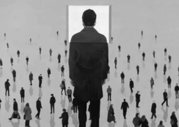 Gri arka plan önünde, ortada sırtı dönük bir adam silueti var, önünde beyaz bir dikdörtgen alan yer alıyor, çevresinde farklı yönlere yürüyen onlarca insan figürü bulunuyor.