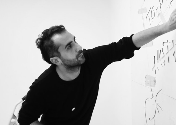 Siyah beyaz fotoğrafta 30’larında kısa saçlı bir erkek beyaz duvara çizim yapıyor. Koyu renk uzun kollu bir kazak giyiyor.