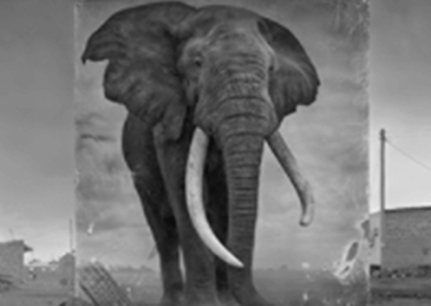 Görselin merkezinde büyük dişlere sahip bir fil yer alıyor. Filin görüntüsü, binaların önüne asılmış bir poster üstünde, görsel siyah beyaz tonlarda.