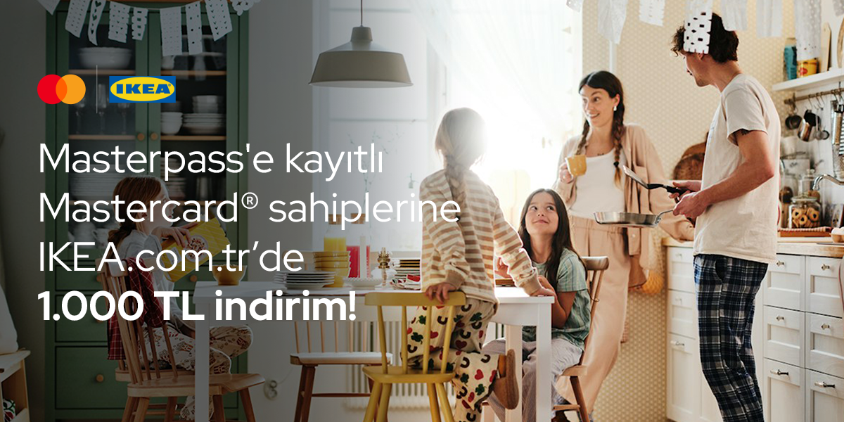 Mastercard logolu Odeabank banka veya kredi kartlarınızla https://www.masterpassplus.com adresine üye olduktan sonra aldığınız indirim kuponunu, 14.12.2025 tarihine kadar, IKEA.com.tr ve IKEA mobil uygulamasında 6.000 TL ve üzeri mobilya ve aksesuar alışverişlerinde kullanabilirsiniz. Detaylar için: https://www.masterpassturkiye.com/masterpassplus/ikea/ikea sayfasını ziyaret edebilirsiniz.
